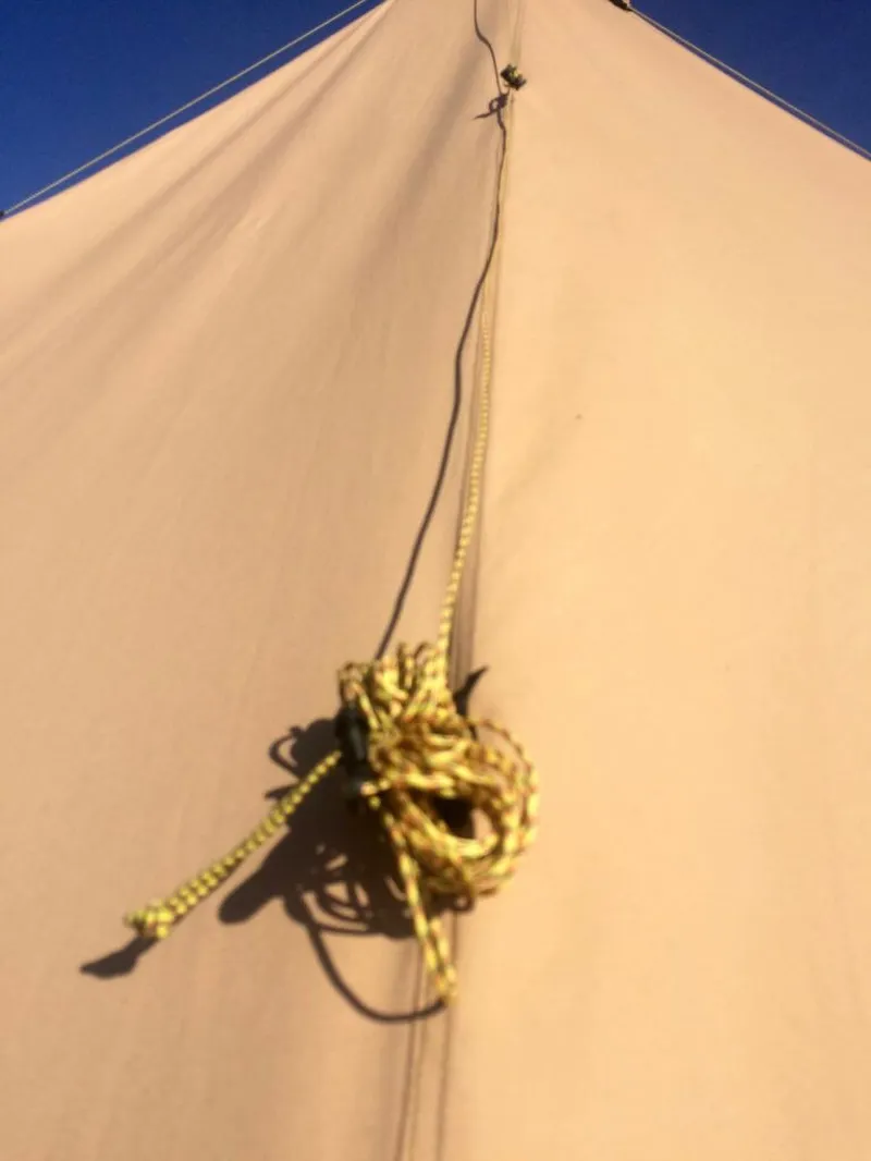 4. If the top storm guy is hard to reach on a Safir or Zirkon 9, store both the top and bottom storm guys on the lower elastic. Tentipi have since lowered the guying points on newer Nordic Tipis, so this is mainly relevant on older models.